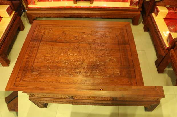 為什么筆者要重點(diǎn)介紹這一張大平幾呢,原因就在它的正上方,在其表面處刻畫有該款沙發(fā)中最為別致艷麗,曠古絕美的紋理圖案——“八仙過海”圖。倚靠著那精細(xì)、生動(dòng),盡筆勾勒描繪出來,雕刻木紋的一絲一畫,我們可以看見:那洶涌澎湃的海水,激打出來的,那一層又一層高高的海浪;還有在其海浪的上方,則是那八位神通廣大的仙人各顯神通,一起漂洋過海而去的生動(dòng)畫面,各處細(xì)節(jié)處展現(xiàn)得十分惟妙惟肖,形態(tài)逼真,優(yōu)雅而別致,完整地刻畫了這一幅只有在神話故事傳說中才能聯(lián)想到的壯偉畫面,仿佛令人身處畫中,意猶未盡…
